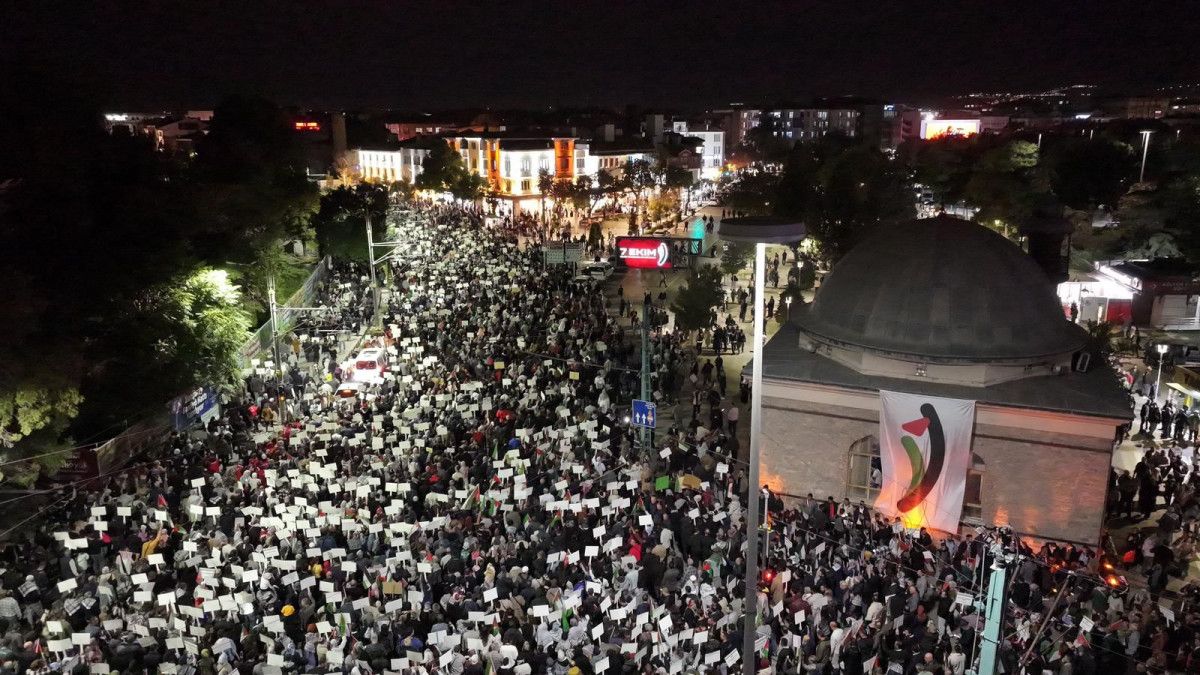 Kırmızı ışığın aydınlattığı meydanda derin bir sessizlik hâkim olurken vatandaşlar ellerini semaya kaldırarak Filistin halkı için dua etti.