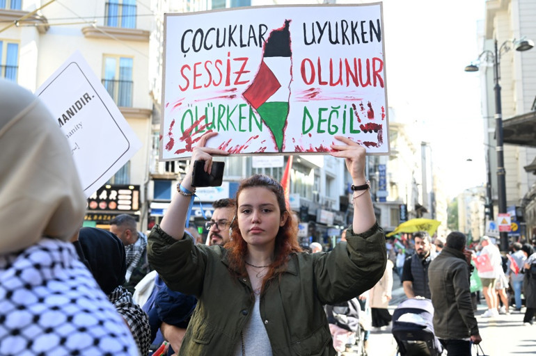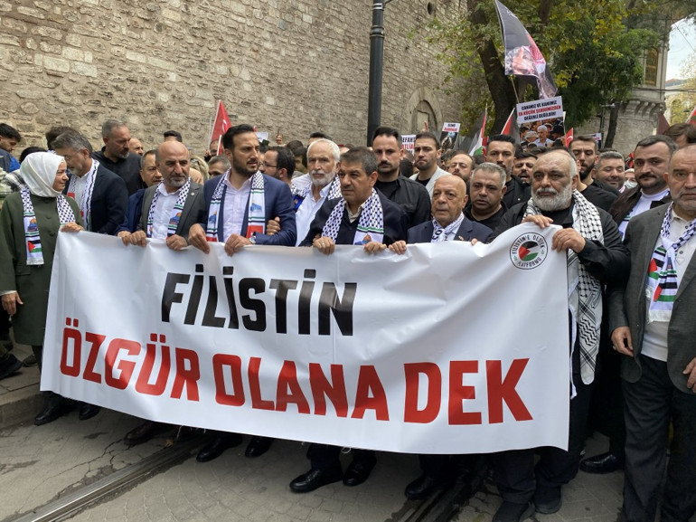 "Ben Gazze'deki çocuklar için yürüyorum sen ne yapıyorsun?", "Yürü kardeşim ayağına Kudüs gücü gelsin", "Bir sabah gelecek kardan aydınlık", "Zulmün olduğu yerde tarafsız kalınmaz" yazılı döviz ve pankartlar taşıyan grubun yürüyüşü devam ediyor.Etkinlik kapsamında Eminönü Meydanı'nda konuşmaların yapılması bekleniyor.