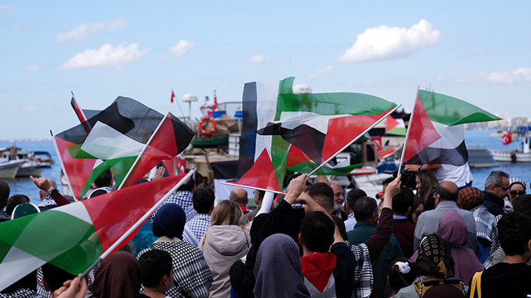 Türk ve Filistin bayrakları asılan teknelere, meydandan toplanan İzmir Sivil Toplum Kuruluşları Platformu üyeleri de ellerindeki Türk ve Filistin bayraklarıyla destek verdi.