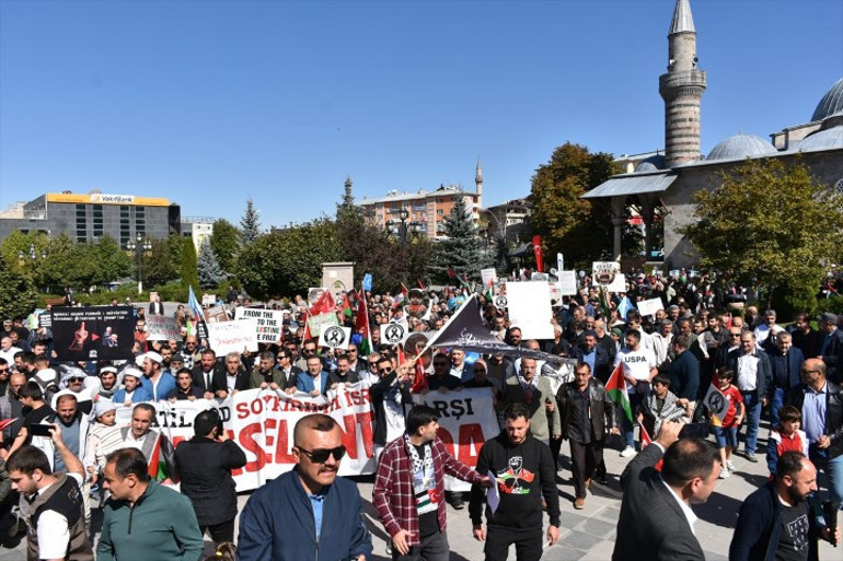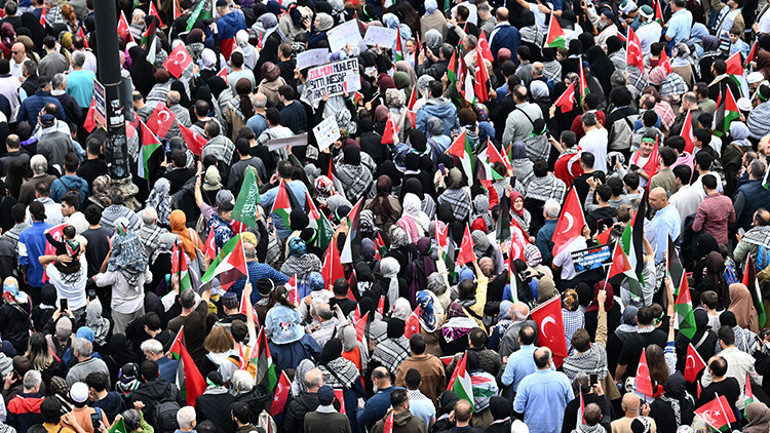 Ellerinde Filistin bayraklarıyla İsrail aleyhine sloganlar atan kalabalık, "Bir adım ötede insanlık ölüyor, kahrolsun İsrail", "Müslümanlar birleşin" yazılı pankartlar taşıyor.