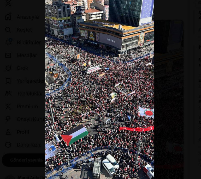 Ankara'da da binlerce vatandaş Filistin'e destek için gösteri düzenliyor. Ellerinde Türk ve Filistin bayraklarıyla gelen çok sayıda vatandaş 'Gazze yalnız değildir' mesajı veriyor.