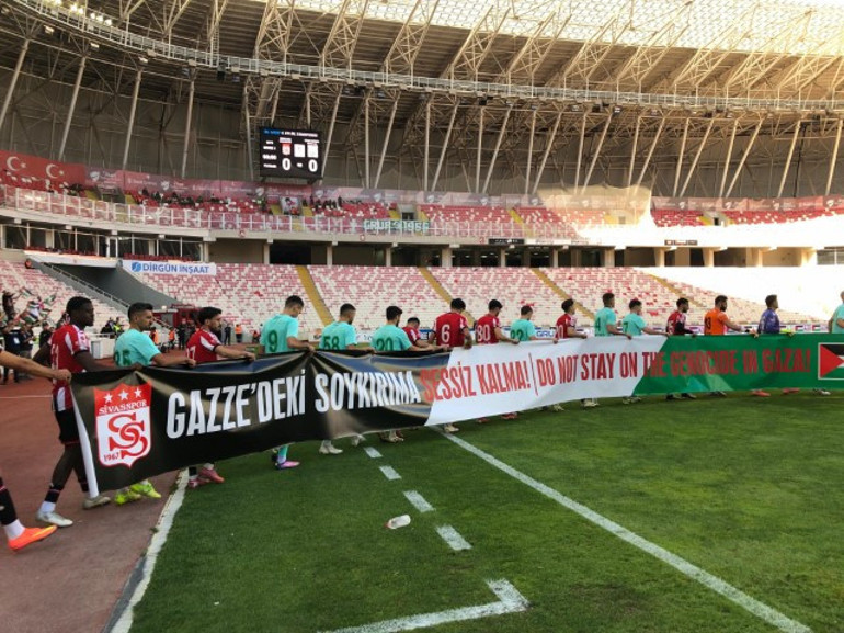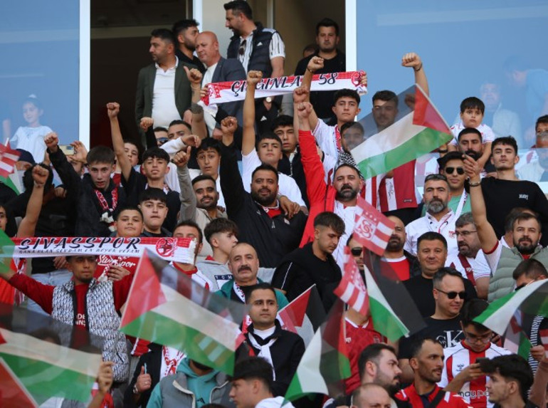 Tribünlerde kırmızı-beyazlı renklerin yanı sıra Filistin bayrakları da dalgalandı. Taraftarlar, 'Gazze'deki soykırıma sessiz kalma' ve 'Meşale Sivas'ta yandı, ışığı Gazze'ye ulaşacak' sloganlarıyla Filistin'e destek mesajı verdi.