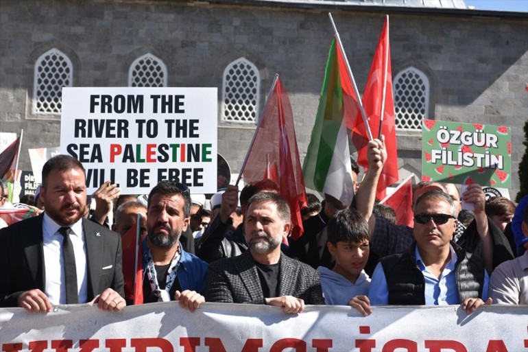Kent merkezindeki Lala Mustafa Paşa Camisi önünde bir araya gelen Erzurum Sivil Toplum Platformu (ESTP) üyeleri ile vatandaşlar, Türk, Filistin ve Sincan Uygur Özerk Bölgesi bayrakları eşliğinde, taşıdıkları döviz ve pankartlarla Havuzbaşı Kent Meydanı'na kadar yürüdü.